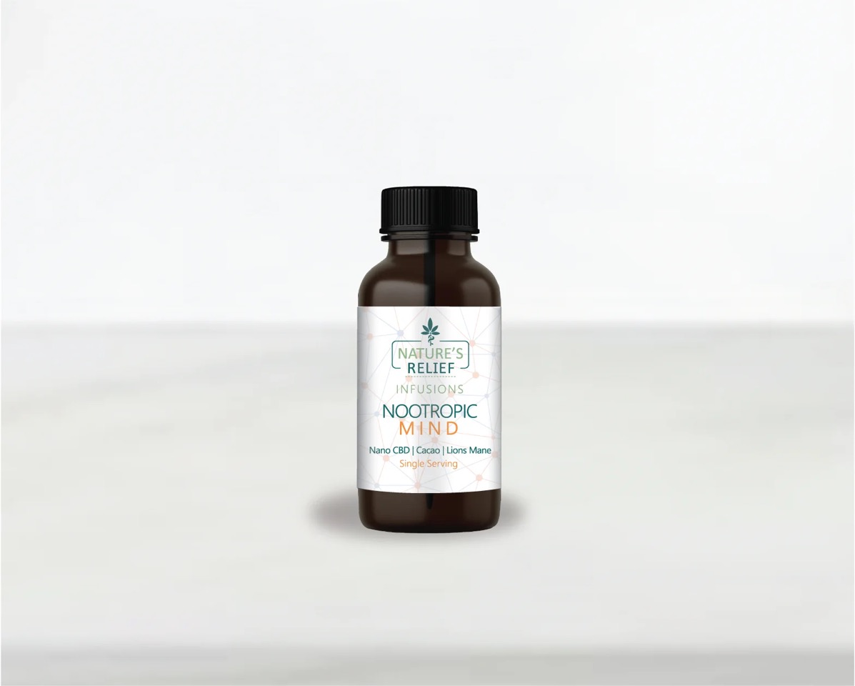 Nature’s Relief Nootropic Mind is a powerful shot designed to support mental clarity, reduce stress, and promote overall cognitive health. This unique blend combines three potent ingredients—Nanopure Nano CBD, Cacao Extract, and Lion’s Mane Mushroom—to enhance alertness, provide neuroprotection, and combat aging effects. With its ability to reduce anxiety and inflammation while boosting brain function, Nootropic Mind is the perfect natural solution to thrive in today’s fast-paced world.